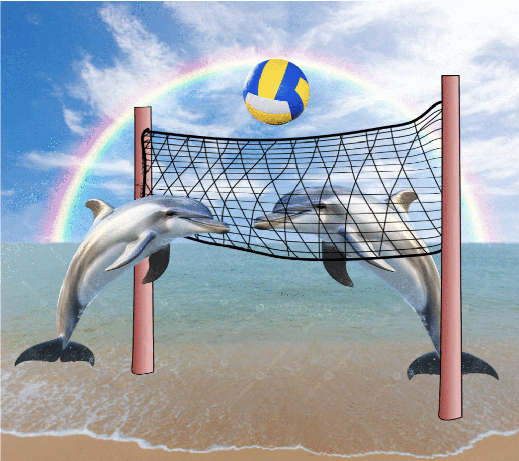 This is a reference from a meme, with a photo of two dolphins playing volleyball on the beach in Adobe Photoshop.